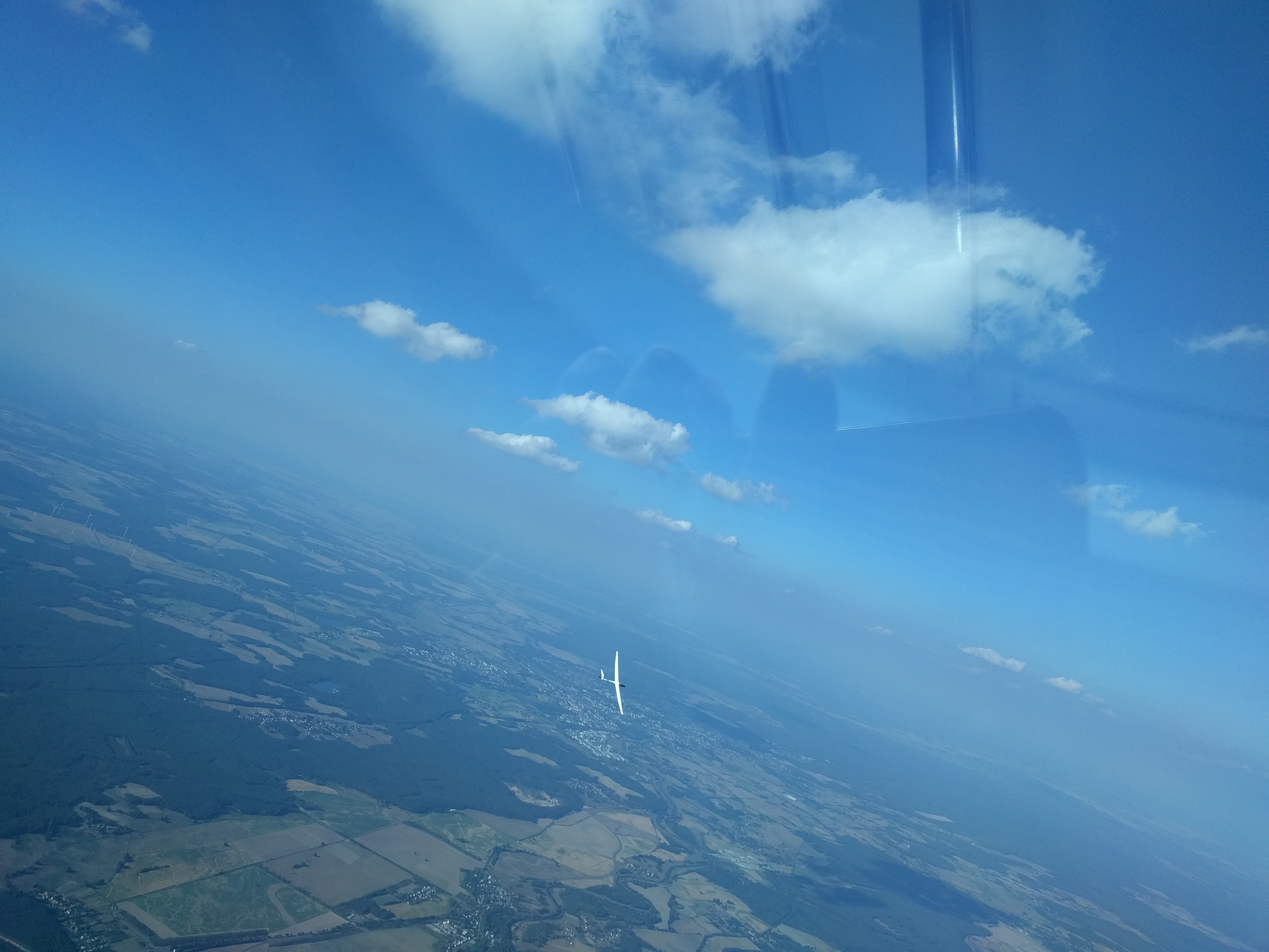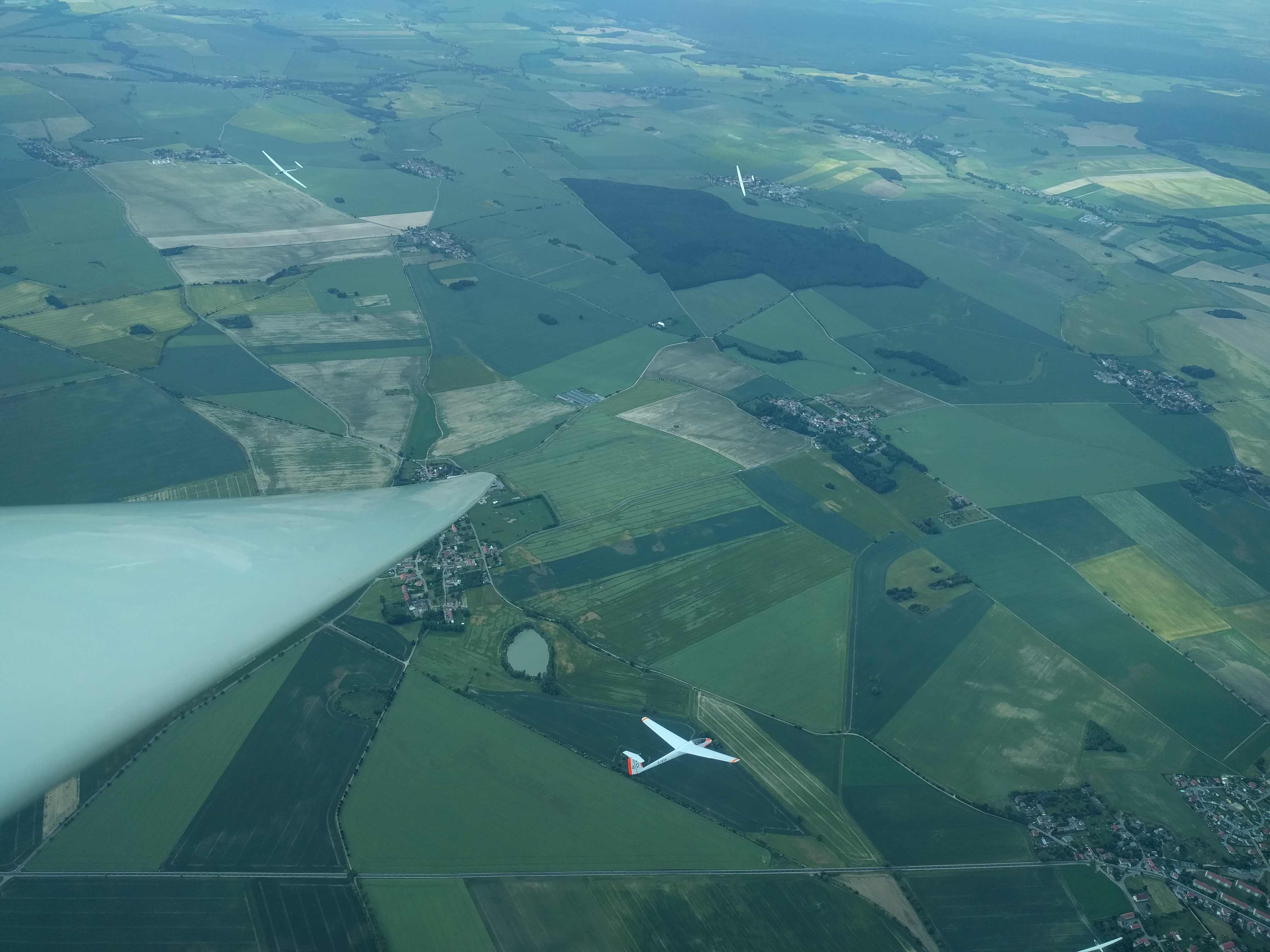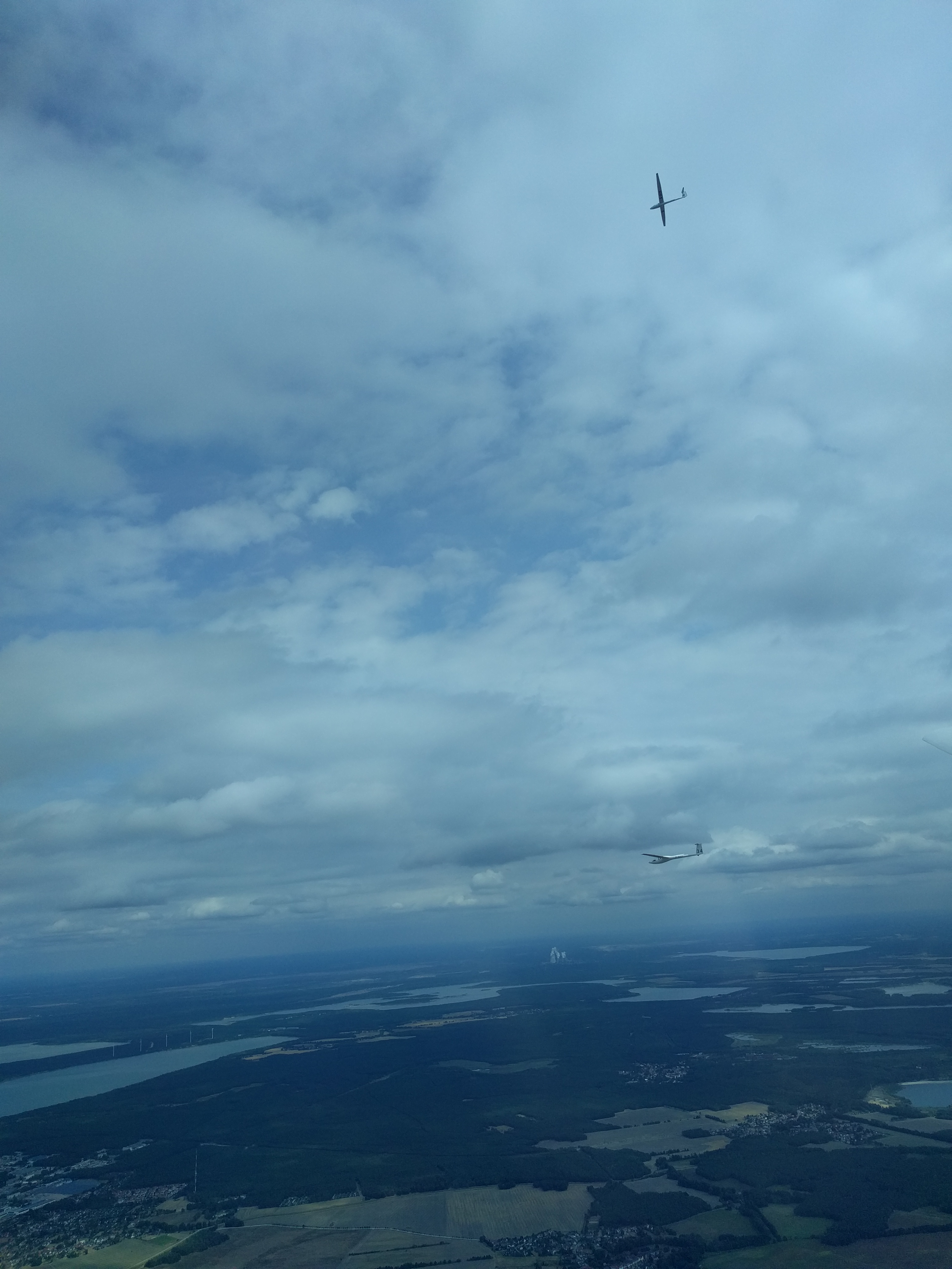 Tag 4 war dann wieder ein schönes Dreieck Richtung Nordenwest, dann nach Nordost (Cottbus) und wieder zurück. Hierbei habe ich gelernt, das man locker mal aus 1800m 30km durch ein blaues Loch (also ein thermisch sehr schlechtes Gebiet, in diesem Fall der Spreewald bei Lübbenau) durchgleiten kann, um dann an einer markanten Wolke in nur noch 700m Höhe anzukommen und dort dann 3 Meter wieder auf knapp 2000 zu kurbeln. Das war übrigens in der Nähe von Lieberose, wo ich 2015 beim ersten Jahr Riesa aussengelandet bin ;-). Hierbei hab ich sogar die Libelle so steil gekurbelt, das ich selbst meinen Trainer überstiegen hab, der sich dann doch sehr über den Lernerfolg gefreut hatte 🙂 Dann ging es wieder zurück, auch weil der Flori ein Verspannunsproblem hatte und dann vorzeitig in Kamenz gelandet ist. Manu und ich sind dann noch oben geblieben und haben die 300km noch voll gemacht, allerdings wollte ich dann auch nicht mehr so weit vom Platz weg, u.a. auch weil ich Pinkeln musste und meine Motivation nach so einem schönen Flug auch nicht mehr so ganz da war (man ist ja dann eigentlich am Ziel angekommen und fliegt dann nicht nochmal los…). Das Pinkel-Problem, welches man ja durchaus in den Griff bekommen kann, werde ich dann wohl mal mit Plastiktüten in den kommenden Wochen mal in der Badewanne ausprobieren. Denn ich denke, es ist auch wichtig, das man das im Griff hat und somit sich nicht den Flugspaß durch Harndrang verdirbt. Auf ausreichenden Flüssigkeitshaushalt habe ich in dieser Woche auch besonders geachtet, so dass man auch vor dem Flug bereits möglichst viel trinkt. Stichwort: Urin-Check, oder Wasserhaushalt-Check ;-)…