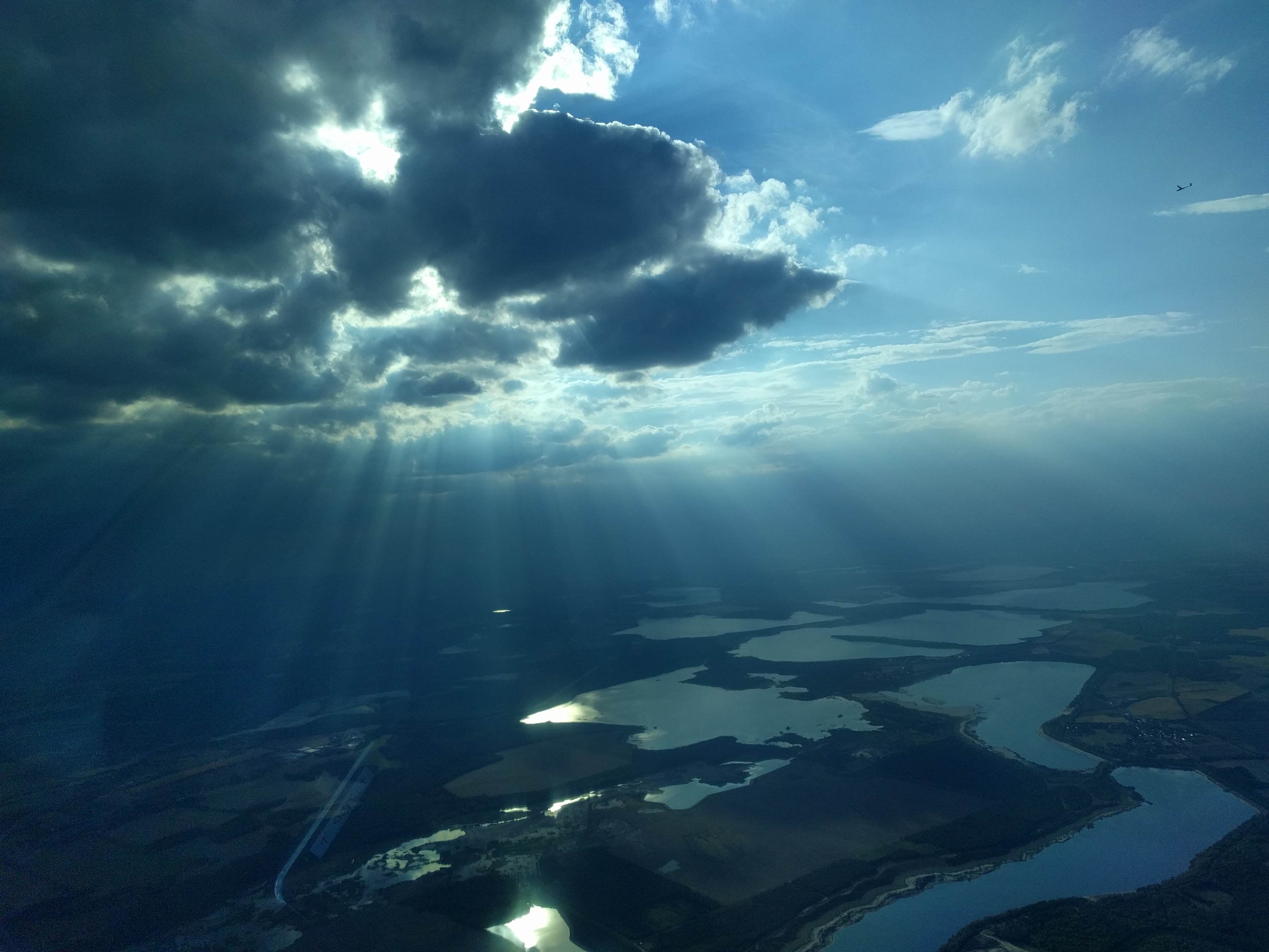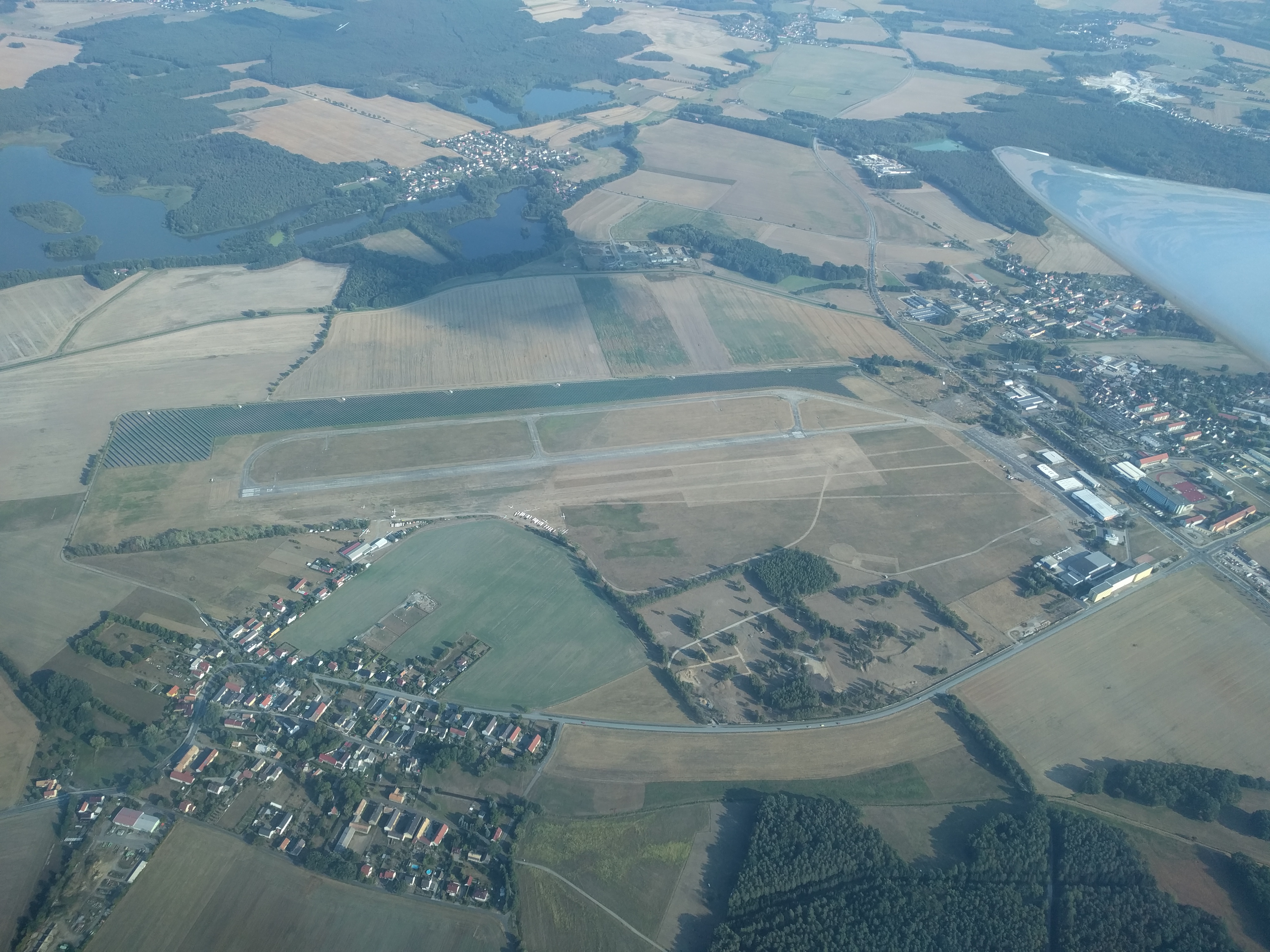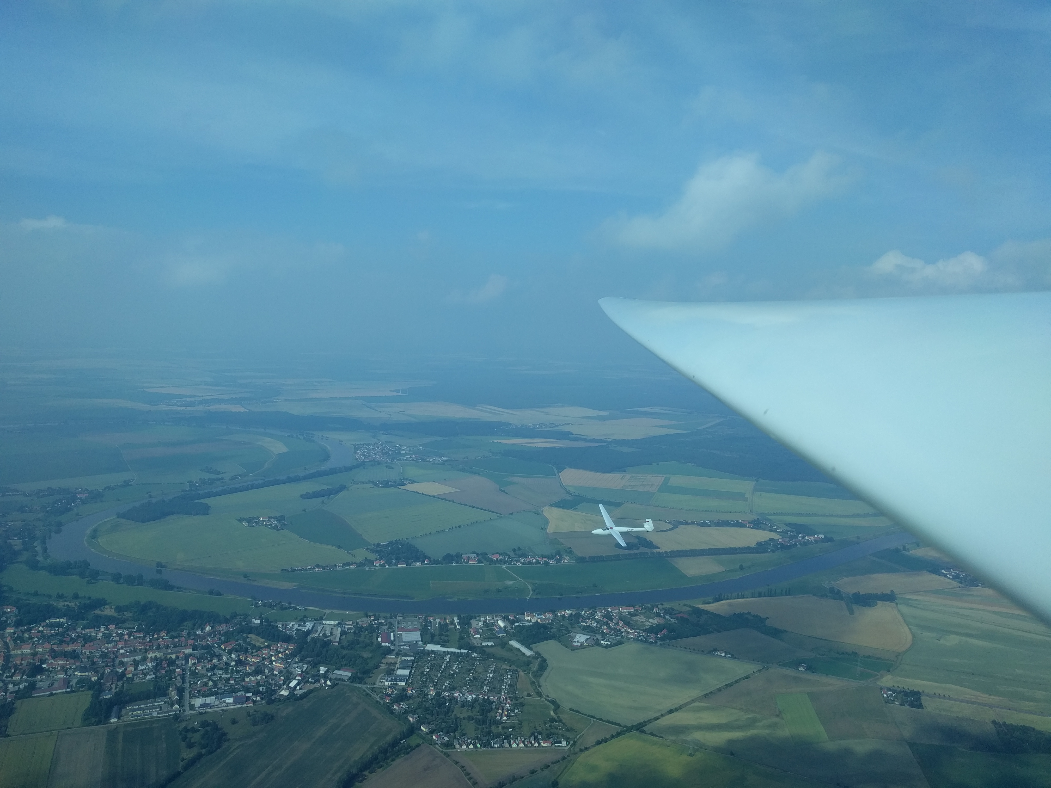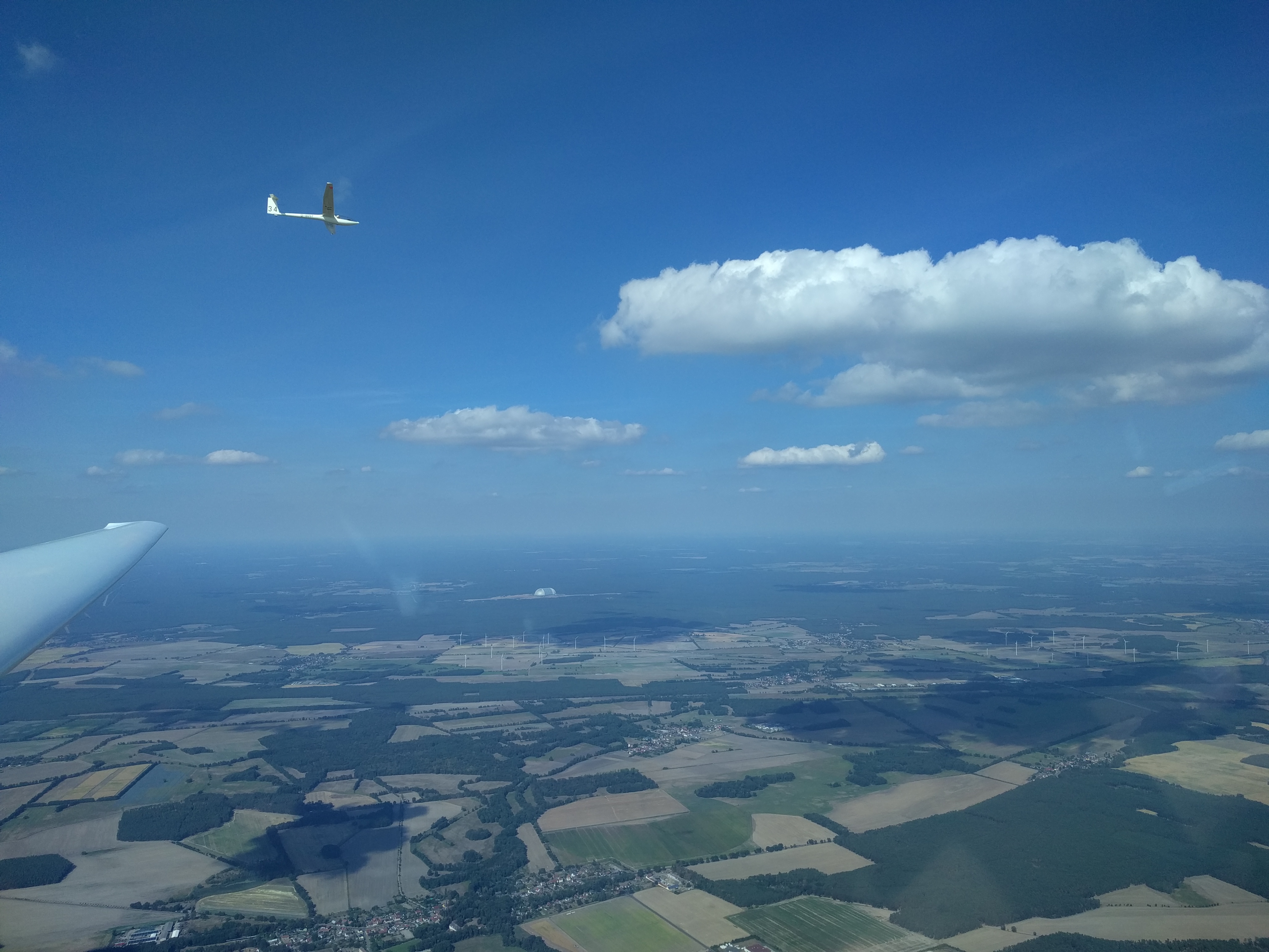 Tag 4 war dann wieder ein schönes Dreieck Richtung Nordenwest, dann nach Nordost (Cottbus) und wieder zurück. Hierbei habe ich gelernt, das man locker mal aus 1800m 30km durch ein blaues Loch (also ein thermisch sehr schlechtes Gebiet, in diesem Fall der Spreewald bei Lübbenau) durchgleiten kann, um dann an einer markanten Wolke in nur noch 700m Höhe anzukommen und dort dann 3 Meter wieder auf knapp 2000 zu kurbeln. Das war übrigens in der Nähe von Lieberose, wo ich 2015 beim ersten Jahr Riesa aussengelandet bin ;-). Hierbei hab ich sogar die Libelle so steil gekurbelt, das ich selbst meinen Trainer überstiegen hab, der sich dann doch sehr über den Lernerfolg gefreut hatte 🙂 Dann ging es wieder zurück, auch weil der Flori ein Verspannunsproblem hatte und dann vorzeitig in Kamenz gelandet ist. Manu und ich sind dann noch oben geblieben und haben die 300km noch voll gemacht, allerdings wollte ich dann auch nicht mehr so weit vom Platz weg, u.a. auch weil ich Pinkeln musste und meine Motivation nach so einem schönen Flug auch nicht mehr so ganz da war (man ist ja dann eigentlich am Ziel angekommen und fliegt dann nicht nochmal los…). Das Pinkel-Problem, welches man ja durchaus in den Griff bekommen kann, werde ich dann wohl mal mit Plastiktüten in den kommenden Wochen mal in der Badewanne ausprobieren. Denn ich denke, es ist auch wichtig, das man das im Griff hat und somit sich nicht den Flugspaß durch Harndrang verdirbt. Auf ausreichenden Flüssigkeitshaushalt habe ich in dieser Woche auch besonders geachtet, so dass man auch vor dem Flug bereits möglichst viel trinkt. Stichwort: Urin-Check, oder Wasserhaushalt-Check ;-)…