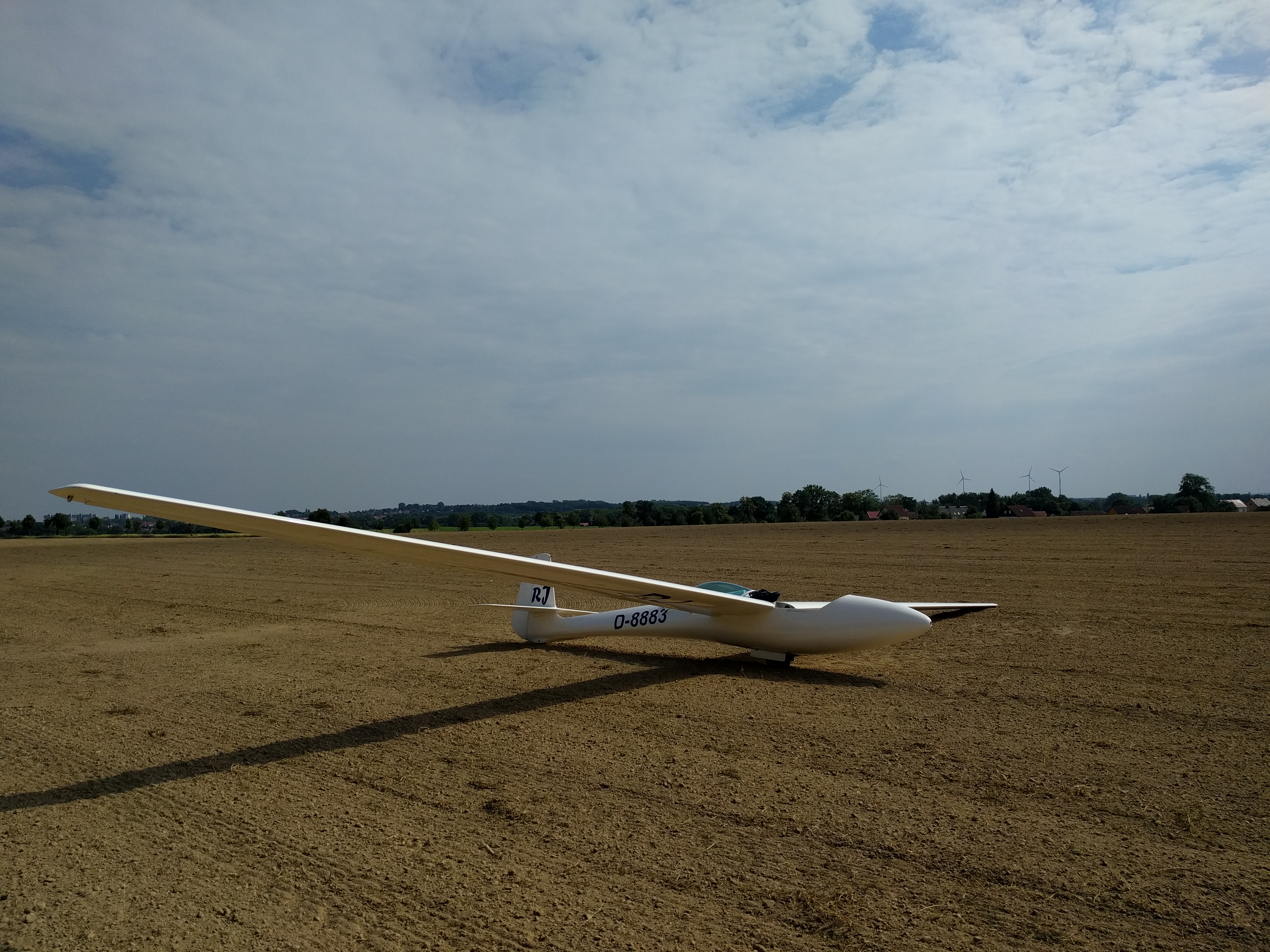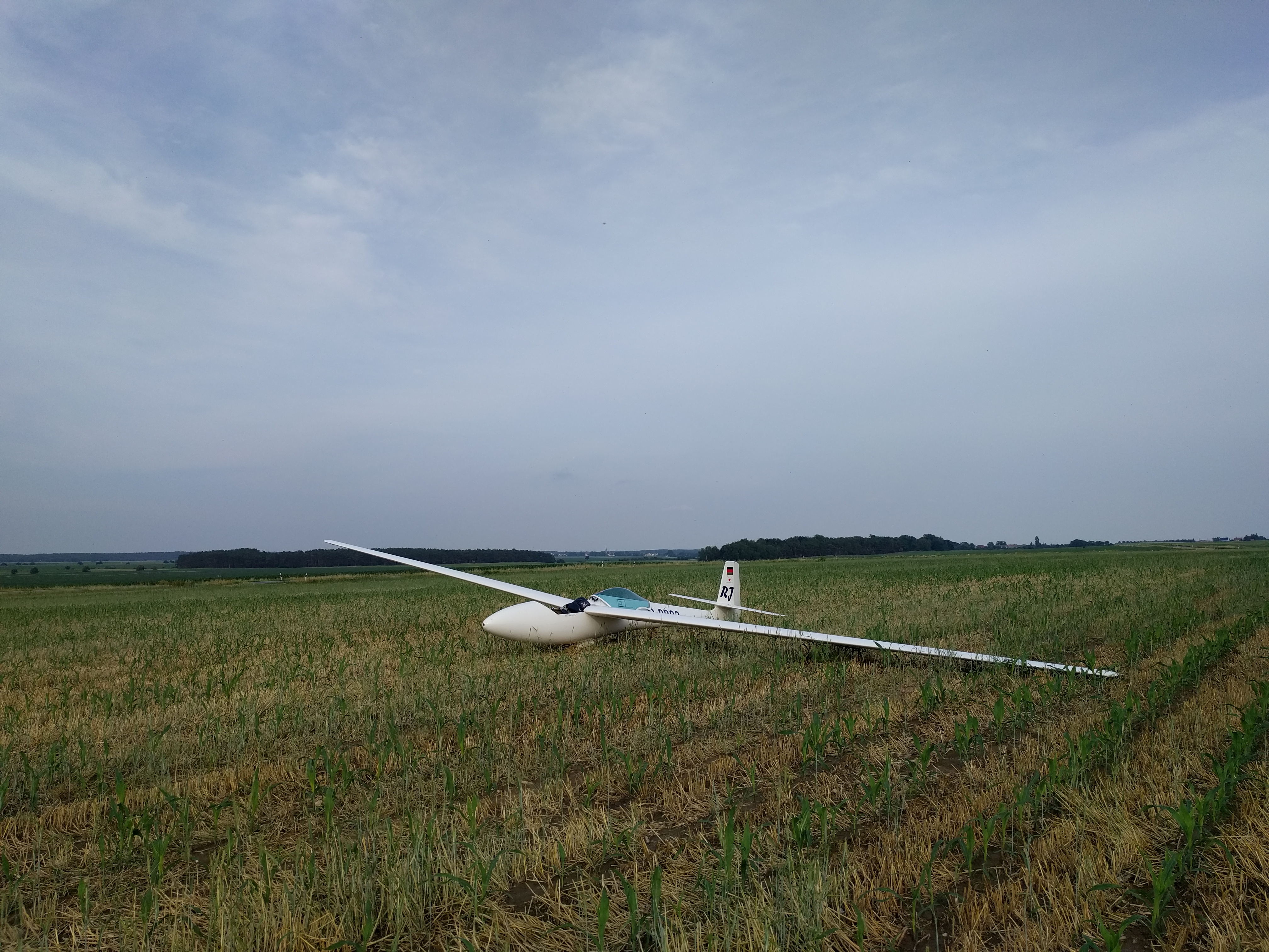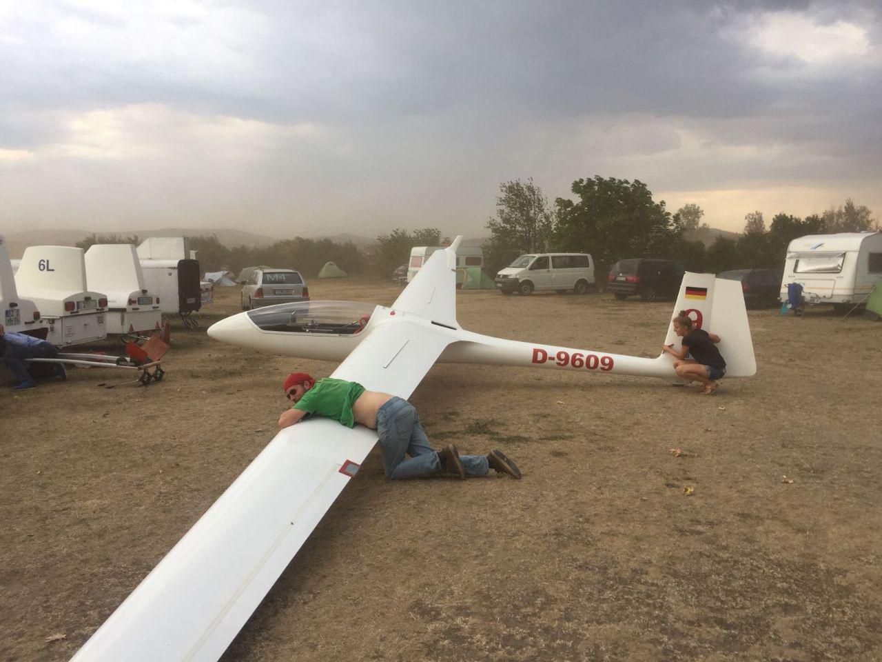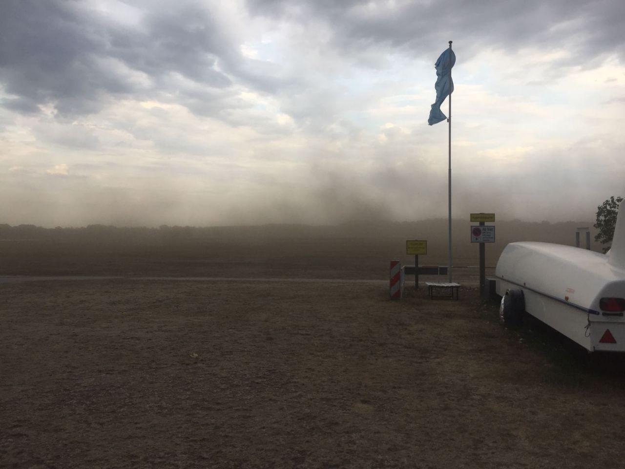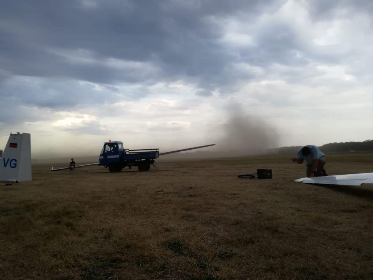 Richtig spannend war dann noch das Ende: Da eine Gewitterfront reinzog, flogen wir zielstrebig in eine graue Wand aus Wolken. Kamenz Info meldete auf Anfrage bereits Schauer über Dresden, was schon nicht gerade weit weg war. Je näher wir kamen, desto dunkler wurde es. Man merkte auch an der Hektik der anderen Flieger, das es langsam Ernst wurde. Sind dann relativ zügig gelandet. Habe dann mit dem Auto den Flieger zurückgezogen und fuhr nochmal los, um Wasser zum waschen zu holen. Dachte es wäre noch Zeit. Man merkte dann aber den deutlich auffrischenden Wind… als wir dann die Flieger neben meinem Anhänger einräumten, fegten bereits zwei heftige Böenwalzen über den Platz. Der vorher frisch gepflügte Acker vor dem Flugplatz entfachte eine riesige Staubfahne. Die Libelle begann sich schon in den Wind zu drehen, aber der Jan hielt sie fest. Da hatte ich echt Angst. Hastig haben wir dann die Flieger Rechts und Links von meinem abgerüstet, dann die Libelle vorgezogen. Das Höhenruder hinten draufgelegt, wurde aber durch eine weitere Böhenwalze runtergeweht. Zum Glück ohne Schacen. Es fing an, dicke Tropfen zu regnen. Wenige Minuten später konnte ich die Libelle eigentlich als letztes Flugzeug zum Glück unversehrt, aber dreckig und mit einer Staubschicht benetzt, in den Anhänger schieben. War mega durchgeschwitzt und danach erstmal fertig, aber froh das sie erstmal in Sicherheit war.