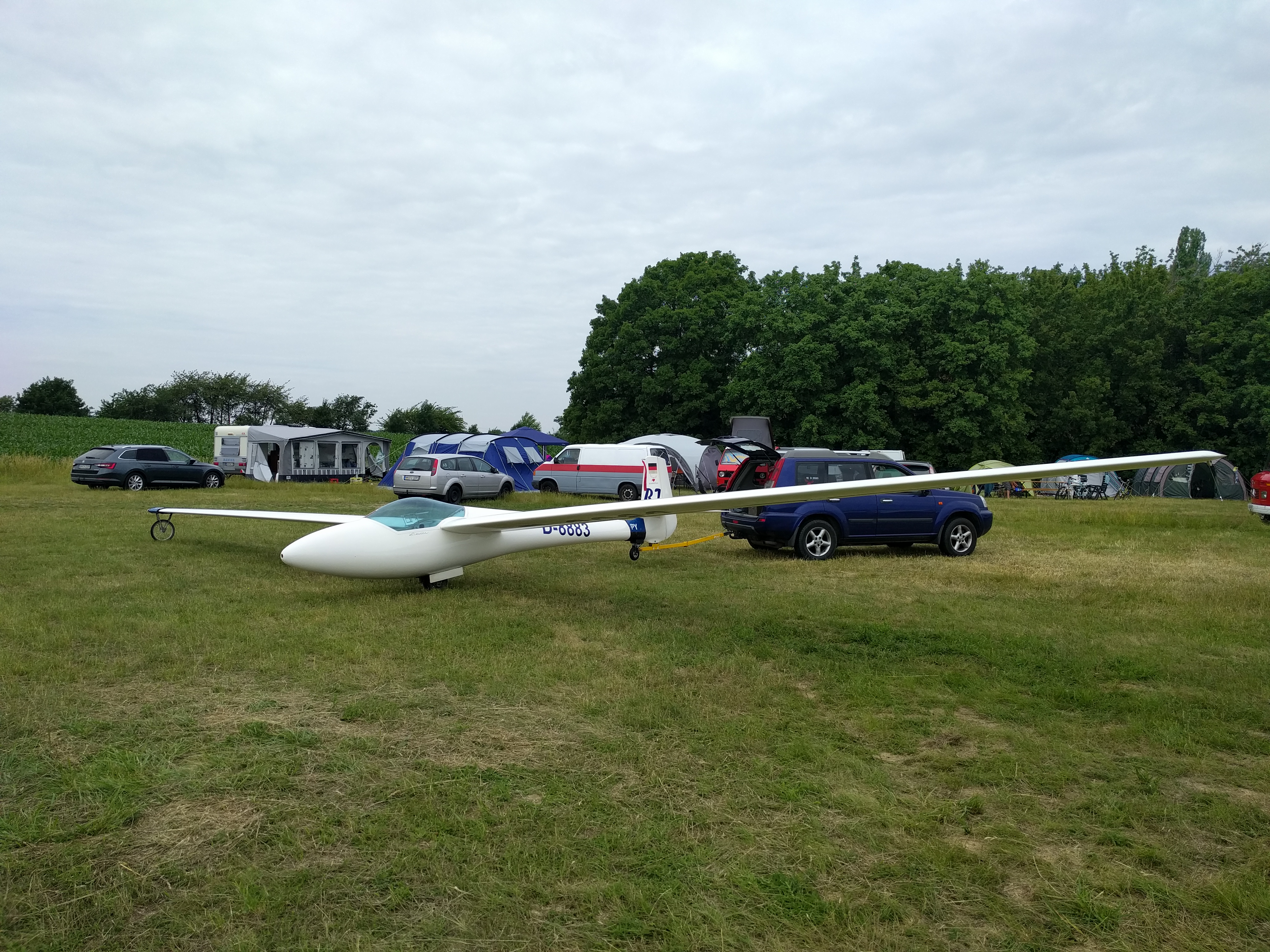 Am 18.08. ging es für mich früh morgens gegen 9 Uhr los nach Kamenz. Die Libelle hatte ich schon direkt am Freitag nach der Arbeit geholt und über Nacht mit nach Hause geholt. Die Fahrt ging erstaunlicherweise ziemlich schnell und gut voran, so dass ich gegen 15:30 Uhr hier in Kamenz aufschlug. Dann Flieger abgestellt, Zelt aufgebaut und die Leute begrüßt, von denen ich einige bereits vom Wettbewerb in Riesa kannte.