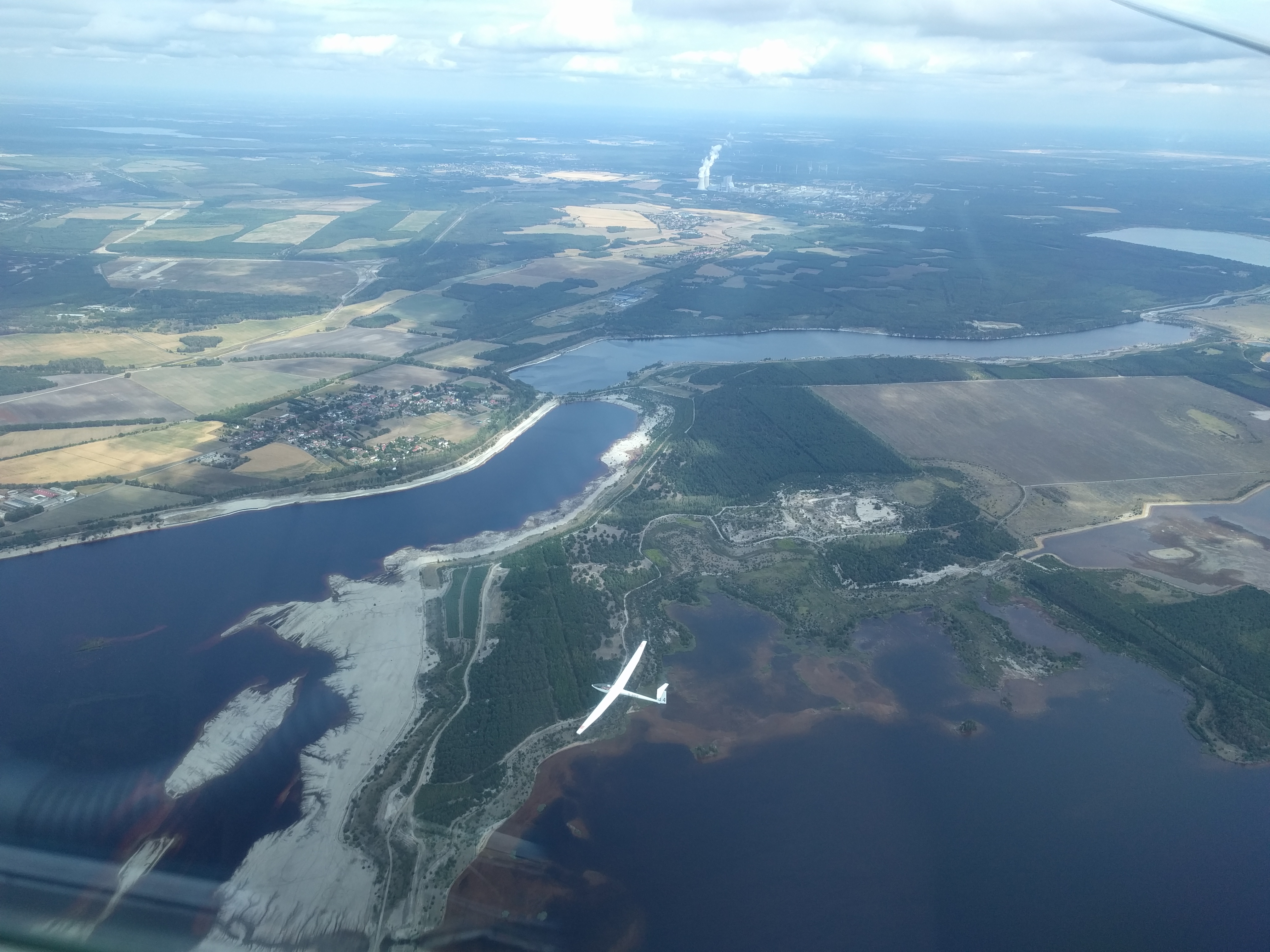 Der dritte Tag war vom Wetter her zwar noch fliegbar, es löste sich aber nach Norden hin auf. Typische Warmluftsituation. Dadurch haben wir unsere eigentliche Aufgabe abbrechen müssen, auch weil Manu einmal tief war. Nachdem sie sich wieder bei Spremberg ausgegraben hatte, sind wir bei etwas tieferen Höhen zwischen 1000 bis 1500m dann von Spremberg zum Kraftwerk Schwarze Pumpe und danach nochmal zum Kraftwerk Boxberg geflogen. Hierbei bin ich das erste mal Kraftwerksthermik geflogen. Diese ist meistens sehr eng aber auch sehr stark, kommt aber oftmals pulsierend vor, da Kraftwerke in der Regel nicht immer bei voller Leistung fahren und immer Leistungshochs und Leistungstiefs haben. Das Kraftwerk Boxberg wollte dann auch nicht so richtig, aber die Wolke südlich vom Kraftwerk über dem See brachte dann wieder Höhe. Sind dann aber zurück nach Kamens und gelandet, obwohl die anderen Teams noch zwei Stunden länger unterwegs waren.