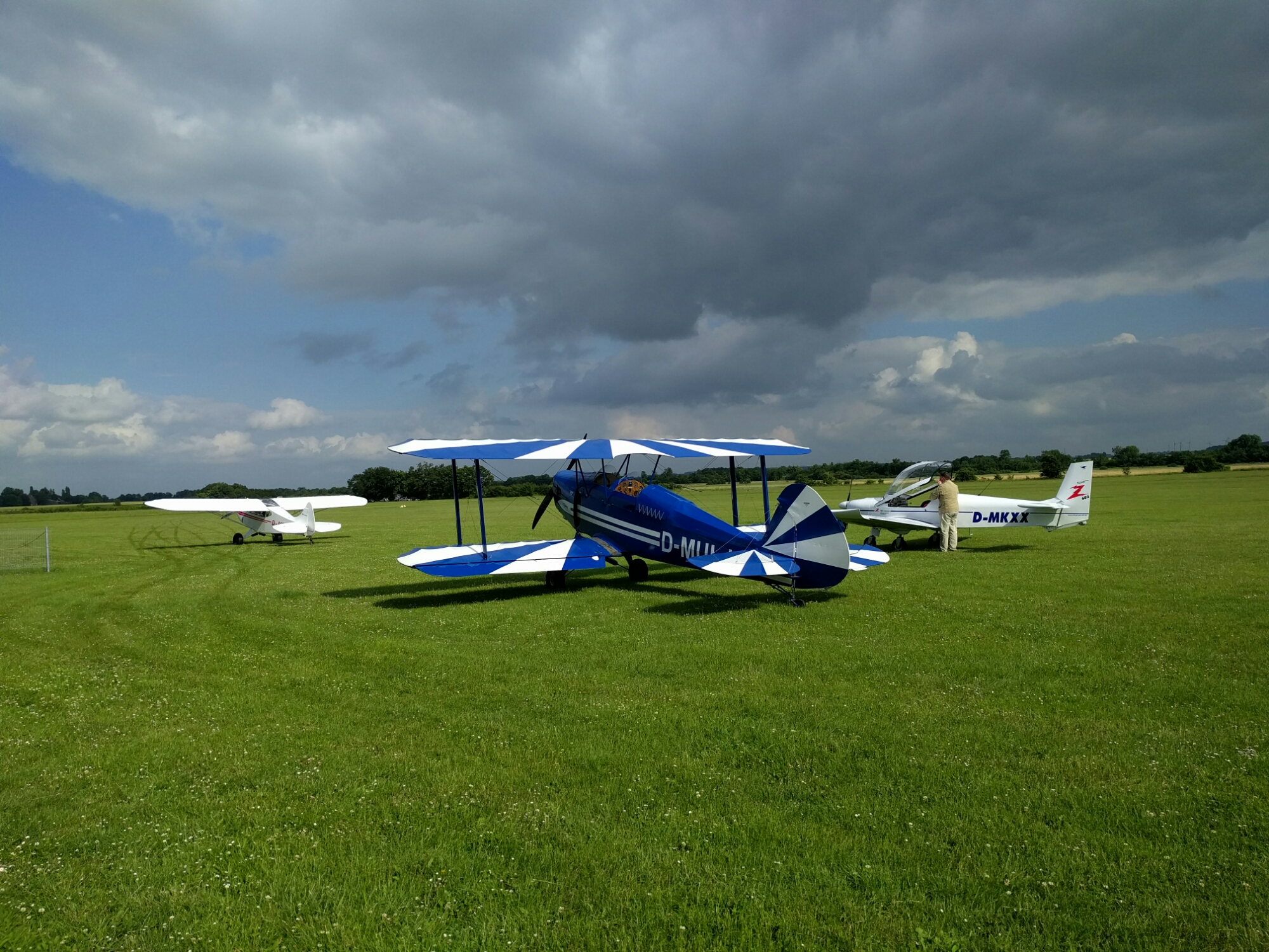 War aber – muss ich gestehen – ziemlich aufgeregt: Erster Streckenflug mit der Karre, unbeständiges Wetter, hoffen das alles klappt und man keinen Fehler macht vor all den Leuten und den Kunstflugpiloten usw… aber irgendwie auch mega cool! Nach zwei Flugshows, u.a. von den Red Devils ging es dann um 16:40 local wieder zurück: Das Regenradar sagte nichts Gutes. Schnell die Savage aus der Parkposition gezogen, rein, Startcheck, Motor sprang sofort an… mussten dann noch warten bis die Kunstflugstaffel gelandet war. Dann über die Piste gerollt, kurz Magnetcheck gemacht: Alles klar, “Delta Mike Romeo Mike Kilo geht in die Bahn und startet”… reingedreht, Vollgas, abgehoben…