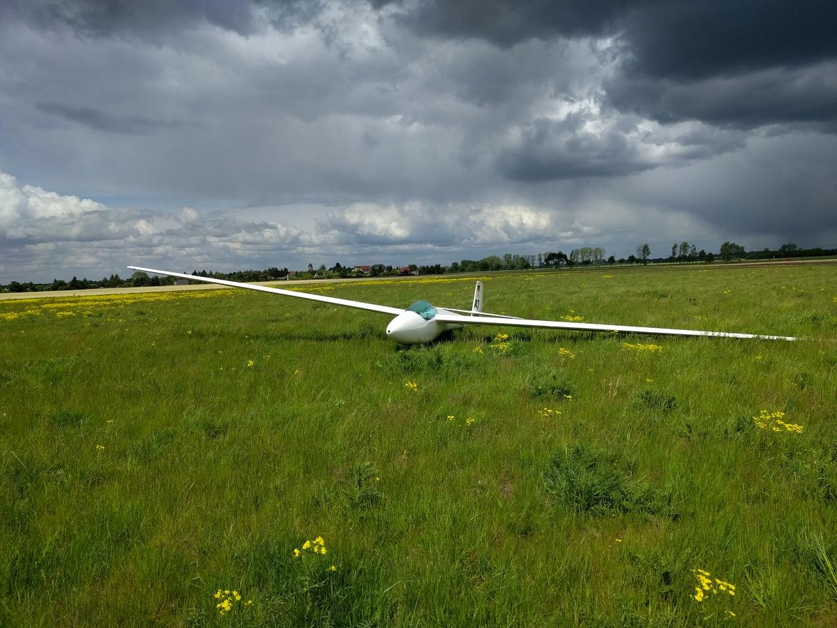 Nach einem Trainingsflug am Donnerstag, an dem ich leider nicht hochkam war, und Freitag neutralisiert wurde, ging es Samstag, 14.05. richtig in die Luft… leider war ich irgendwie noch nicht so richtig dabei, so dass es mich auf den ersten Schenkel der Aufgabe auf den Flugplatz Falkenberg-Lönnewitz gezogen hat… erste Landung auf Asphalt! Das kuriose: Es handelt sich dabei um einen alten DDR-Militärflugplatz, der jetzt in privater Hand ist. Riesengroßes Flugfeld, eine Asphalt-Landebahn und eine Graslandebahn… aber keine Sau da! Ein Berufspilot, der auch dort im ansässigem Motorflugverein ist (Segelflug hatten die da nicht) kam vorbei und schaute mal obs mir gut geht und das wars. Naja. War halt nicht so gut gelaufen.