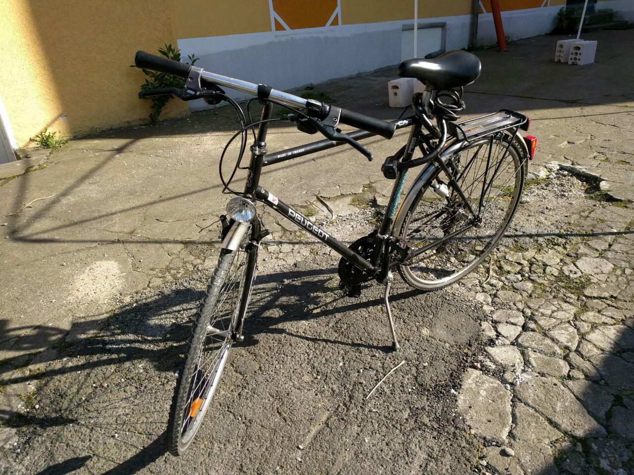 Habe mich jetzt für was solides entschieden. Die Karre ist sicherlich so alt wie ich, wiegt etwas mehr, 21-Gang-Kettenschaltung, 28″ Rahmen, keine Federung (das merkt man!) und keine Hörner.